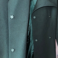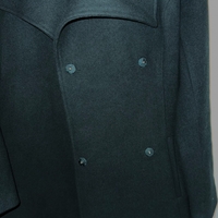 Tummanvihreä villakangastakki, jossa napitus ja vyö sekä avonaiset taskut edessä. Polvipituinen. Takin sisäpuolelta kaksi nappia korjattu, näkyy kuvassa. Muuten takki erinomaisessa kunnossa.