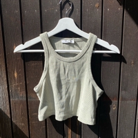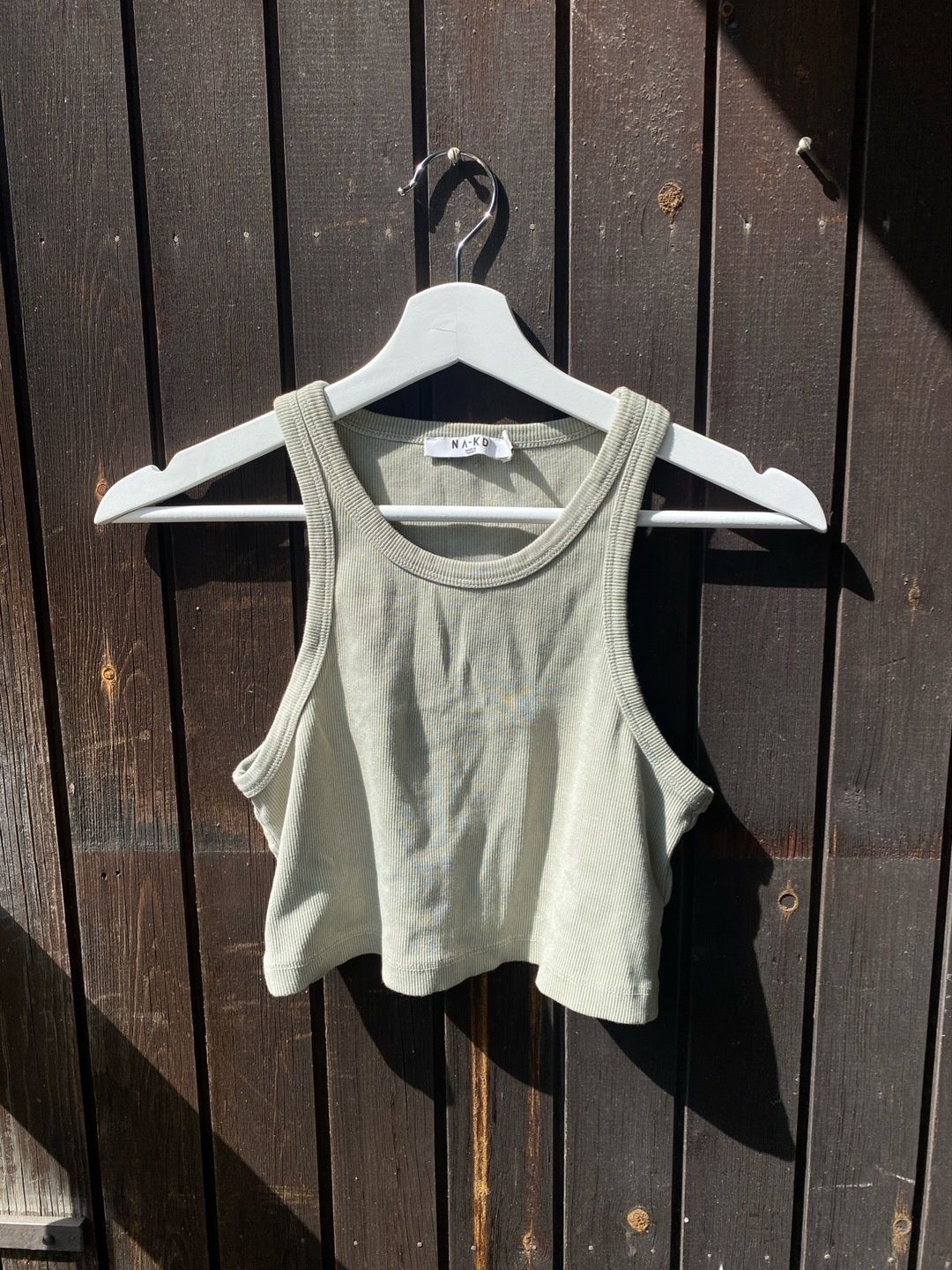 Ribattu ja cropattu tank-toppi ’khakinvihreä'. Ovh 14,95 €. Joustavaa, laadukasta materiaalia, ei ole ohutta tai läpinäkyvää. Todella mukava päällä.