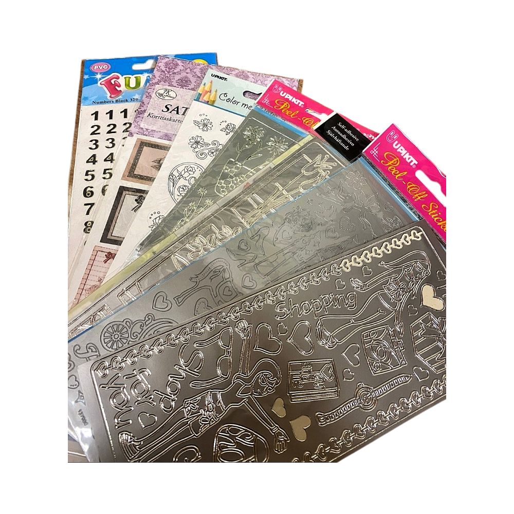 Erilaisia tarroja askarteluun ja koristeluun. Joitakin tarroja käytetty pari.