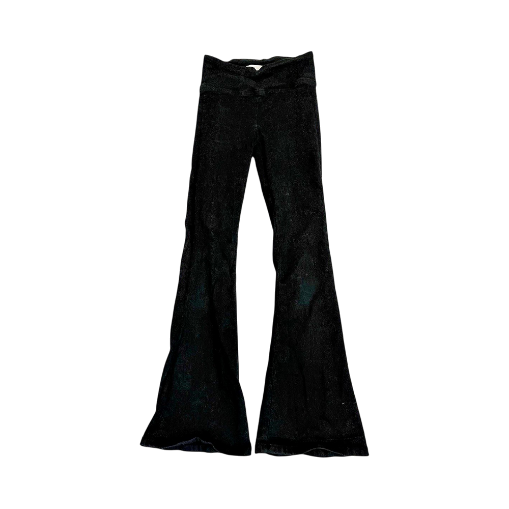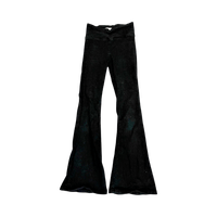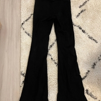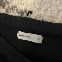Mustat leveälahkeiset farkut, koko S. Farkuissa ei ole sepalusta, taskuja eikä vyölenkkejä. Korkea ja joustava vyötärö, jonka voi kääriä matalammaksi. Vyötärön ympärys ylhäältä venyttämättä 64 cm, alemman sauman kohdalta 66 cm. Sisälahkeen pituus 77 cm.