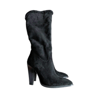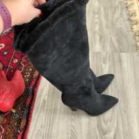 Tyylikkäät ja mukavat pitkät saappaat. Tekomokkaa , tekoturkisreunus ja vuori, , varren ympärysmitta 37cm leveimmästä kohdasta korko 7,5 cm
