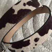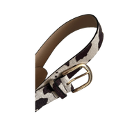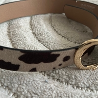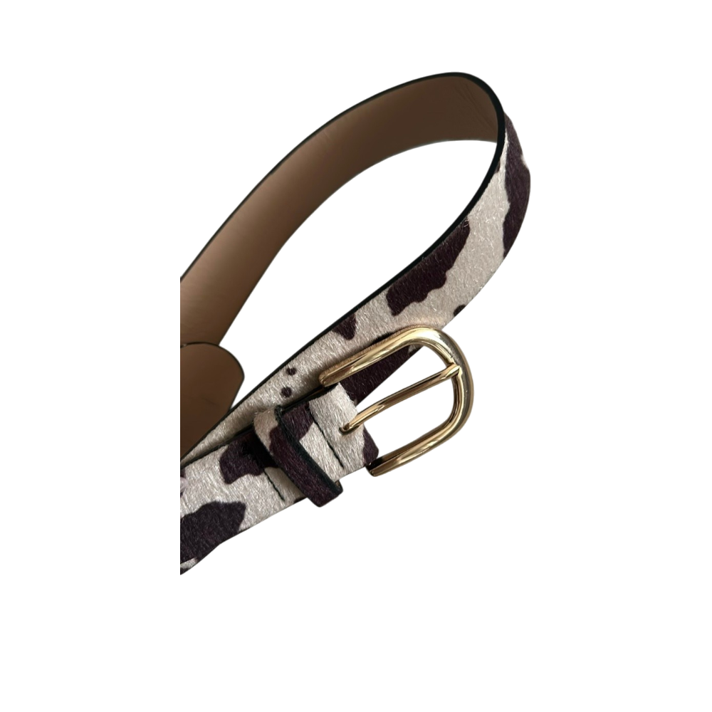 Beige and brown cow print belt with gold-tone buckle. Size XS. 78cm long.