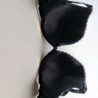 Käyttämättömät, hieman topatut, kaarituelliset mustat plunge-rintaliivit, kupeissa pieni pitsireunus, koko EU 85F/UK 38F.