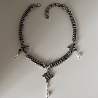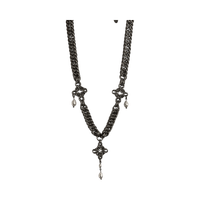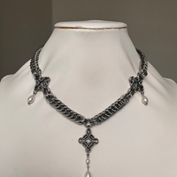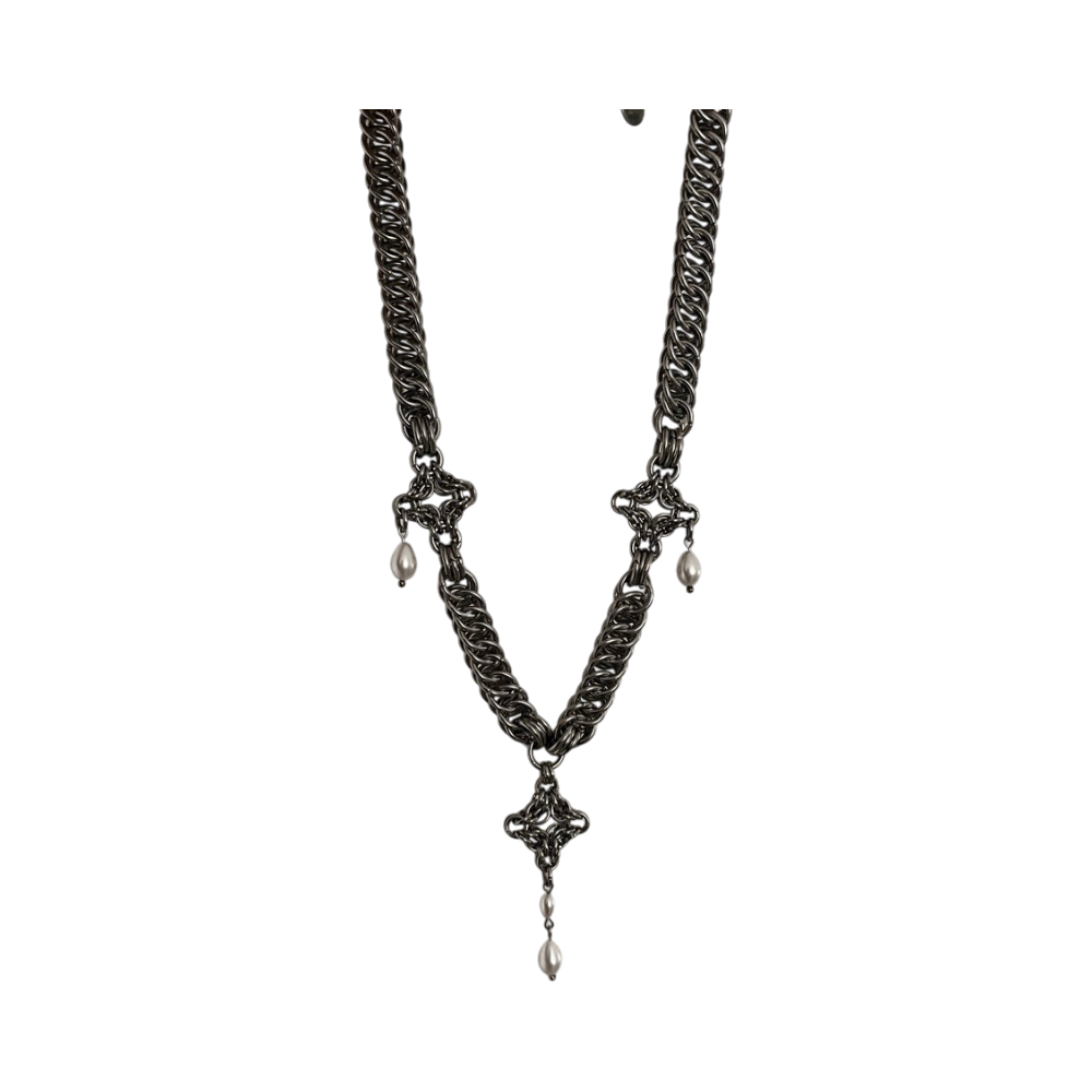 Hopeanvärinen ketjukaulakoru helmiriipuksilla, vintage-tyyli.