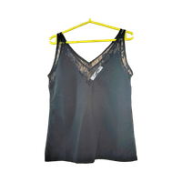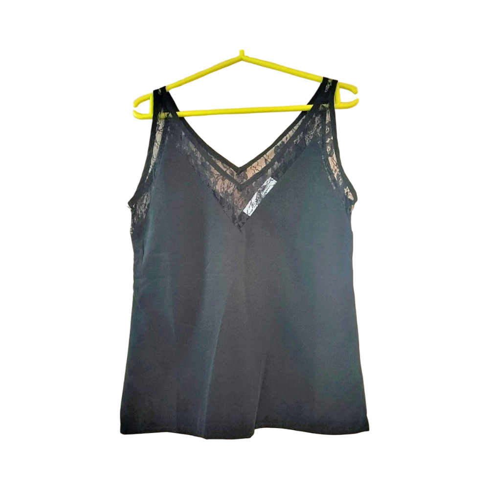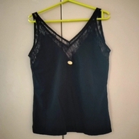 Käytetty musta toppi, jossa pitsiä.
