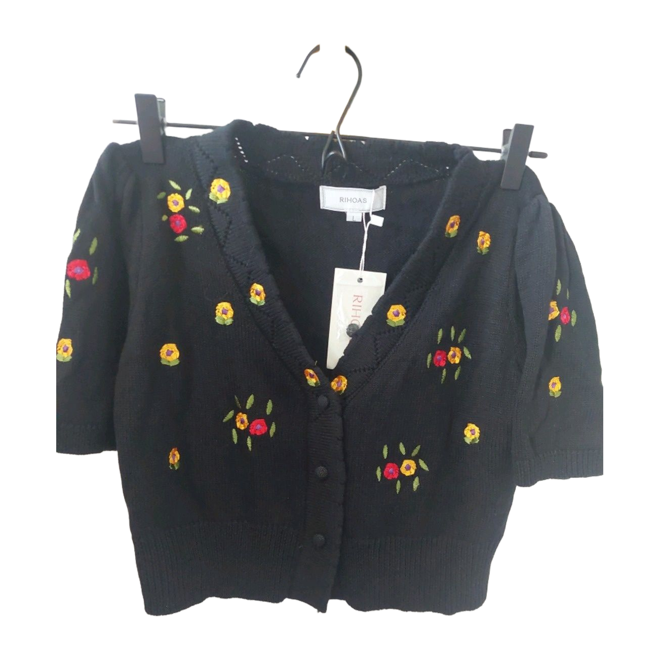 Neulepaita. Lyhyet hihat ja napit. Kaunis kukkakirjoilu. Pieni puhvi hihoissa. Kokolapussa L, mutta itselle pieni ja arvioisin kooksi S.