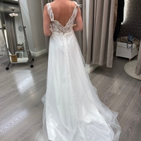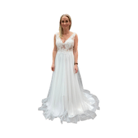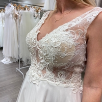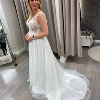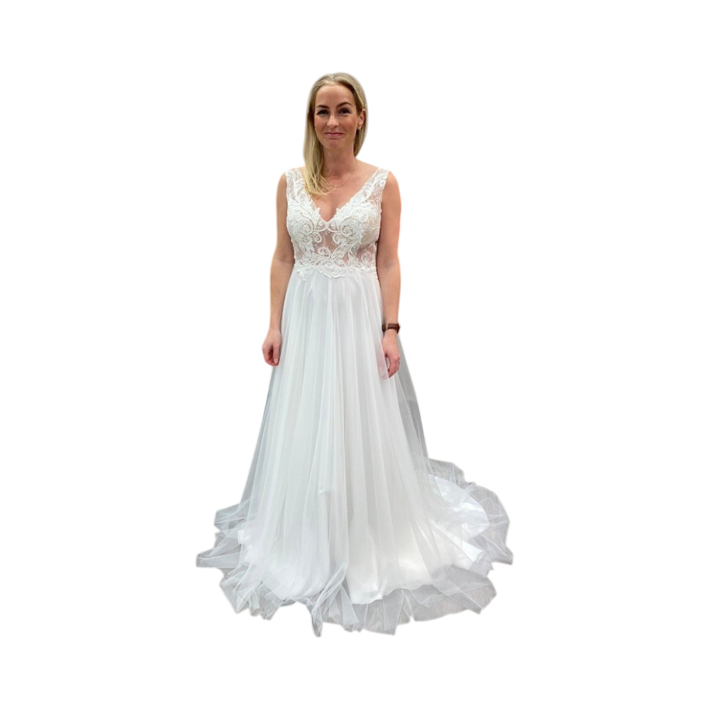 Valkoinen hääpuku jossa pitsiyläosa ja kaksikerroksinen helma. Koko L, joka muokattu ompelijalla minulle kun olin raskaana, tuolloin painoa 65kg, ja käytin kokoa S, pituus 163cm. Helma lyhennetty, olkaimia lyhennetty ja kainaloaukkoa pienennetty. Vyötäröön ei ole tehty muokkauksia.