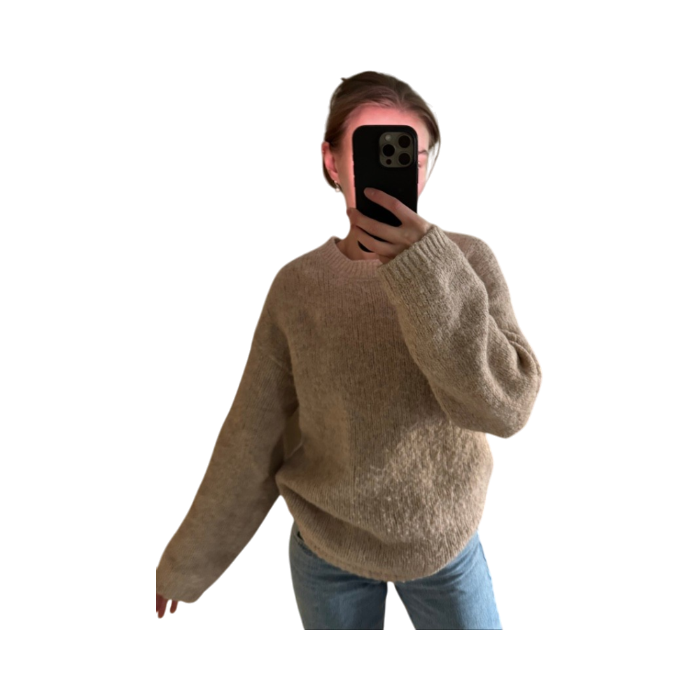 Cozy oversized beige knit, soft wool-blend jumper.