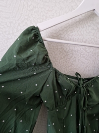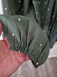 Vihreä mekko valkoisilla pilkuilla, pitkät pussittavat hihat. Vetoketju takana. Kevyt miellyttävä materiaali! Pieni jousto. Hihoja mahdollisuus pitää myös olkapäät paljaana.