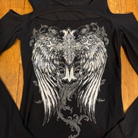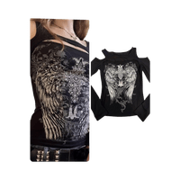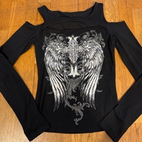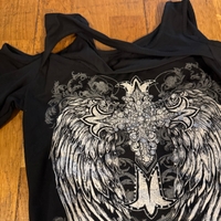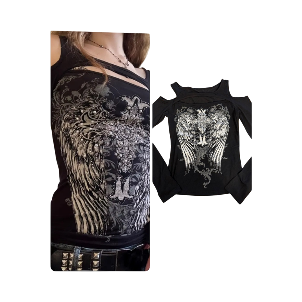 Musta cold-shoulder toppi, hopea siipi- ja ristikuvio, venyvä.