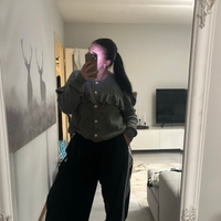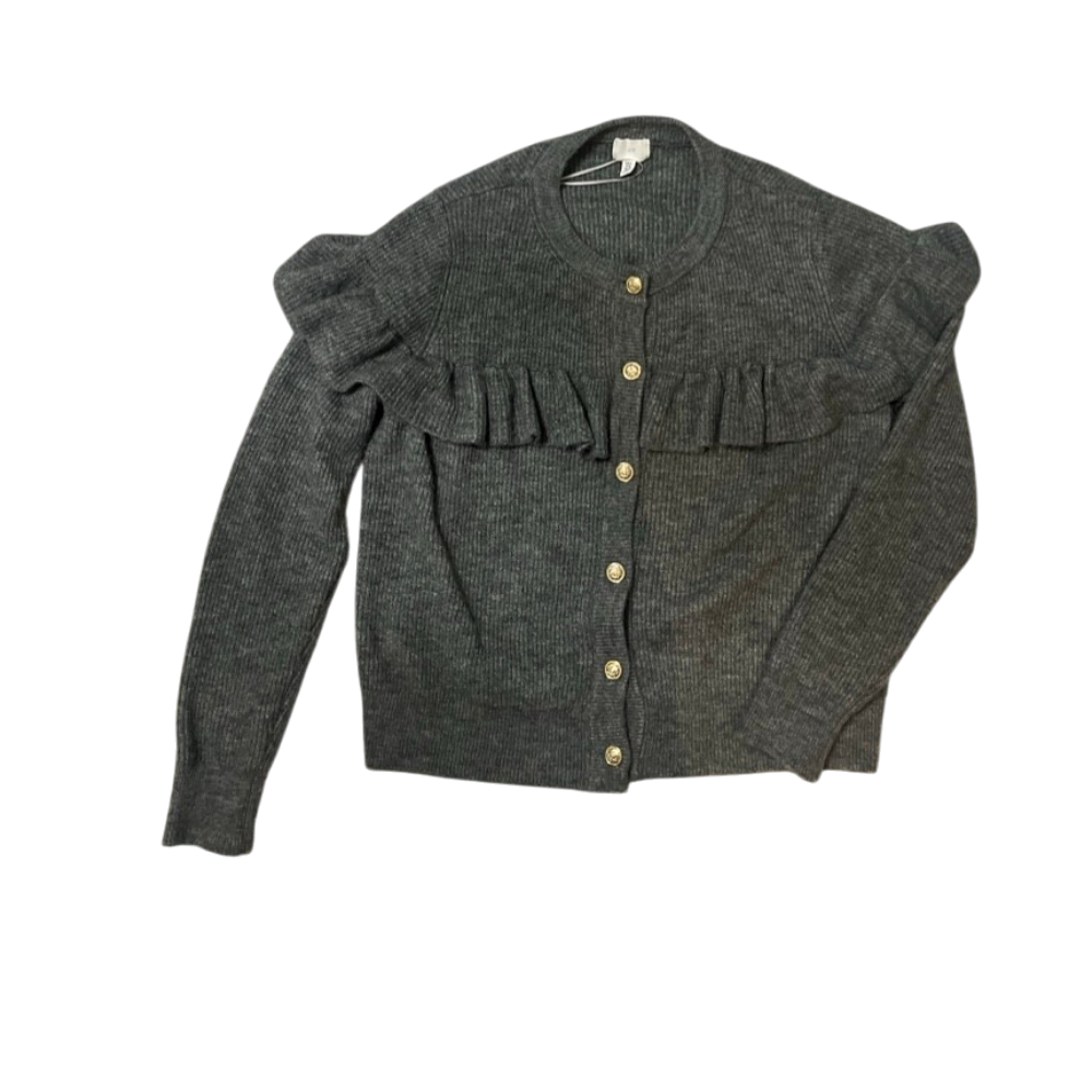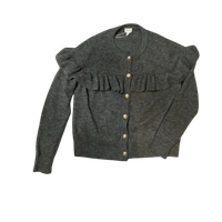 Pitkähihainen harmaa napillinen röyhelökardigan.