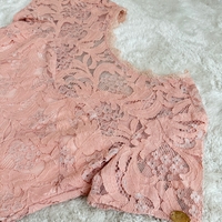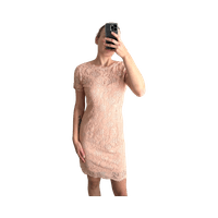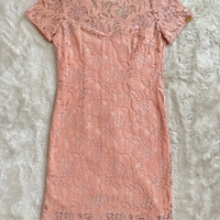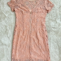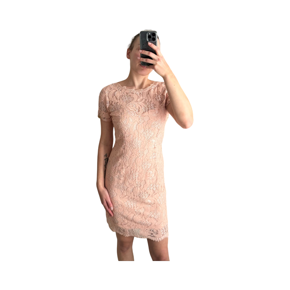 Lyhyt vaaleanpunainen pitsimekko, vetoketjulla takana.