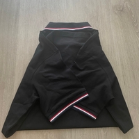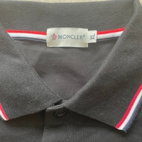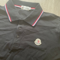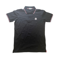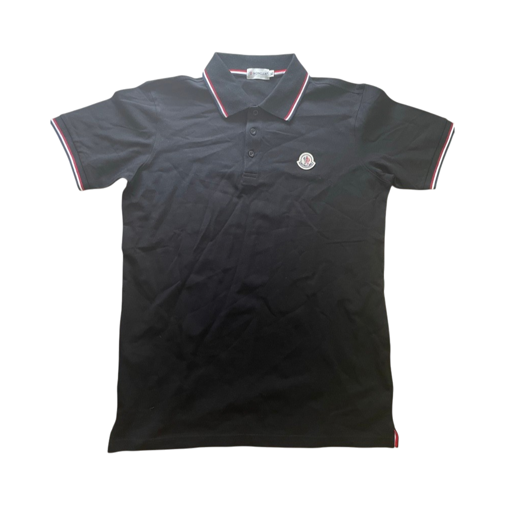 Mustapohjainen miesten Moncler-pikee, raitakulmaukset ja logo. Fittaa L/M koossa