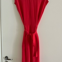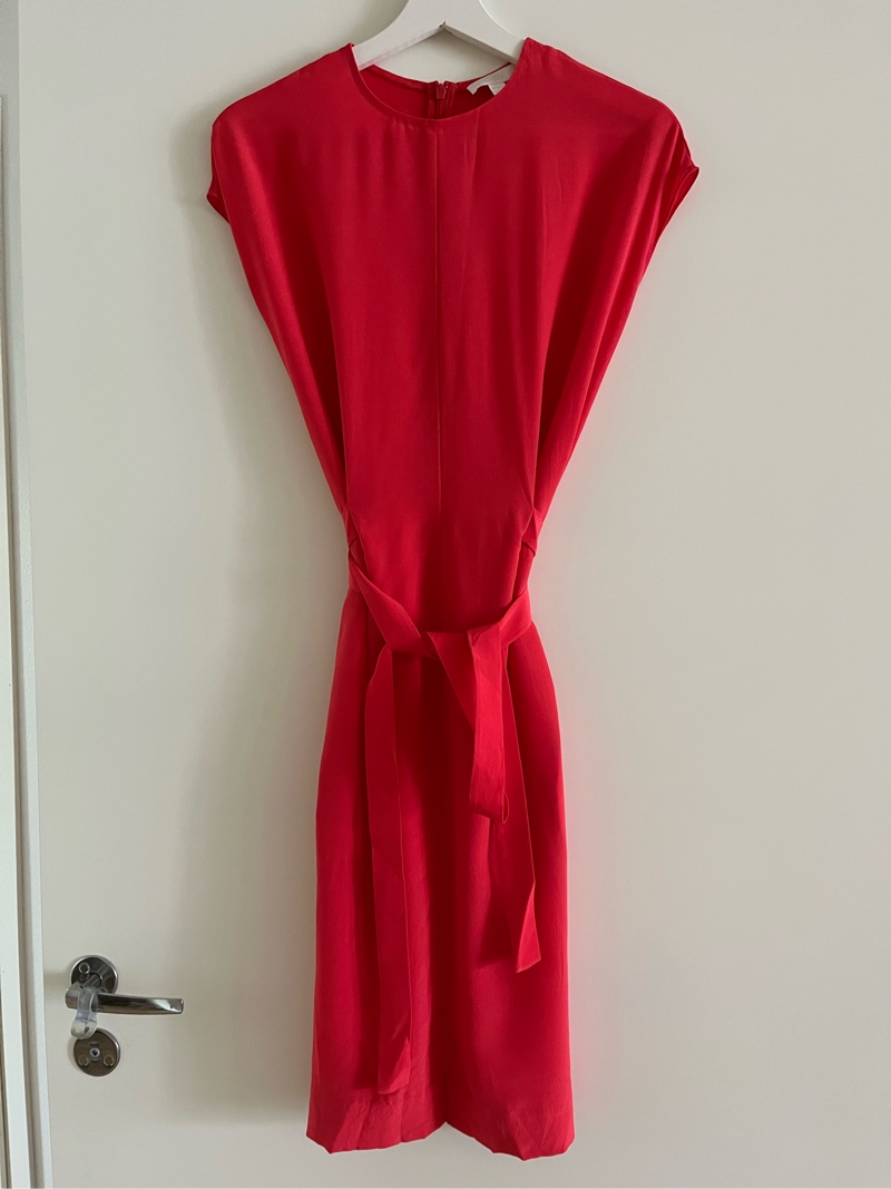Cos mekko 100% silkkiä. Laatikkomainen leikkaus, vyö samaa materiaalia. Väri vadelmanpunainen, todellisuudessa hieman kylmempi sävy kuin kuvissa. Koko 34. Kai-kai 53 cm. Taskut sivusaumoissa.