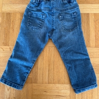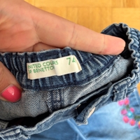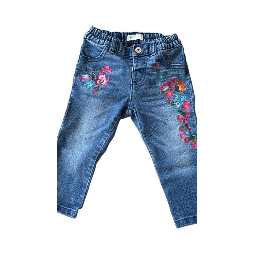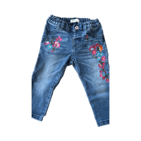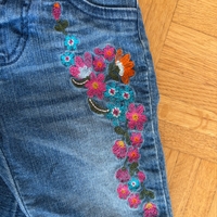 Vauvan farkkuhousut, kukkaompeleilla, vyötäröllä kuminauha ja nappikiinnitys