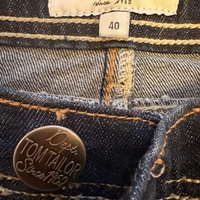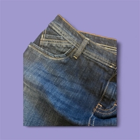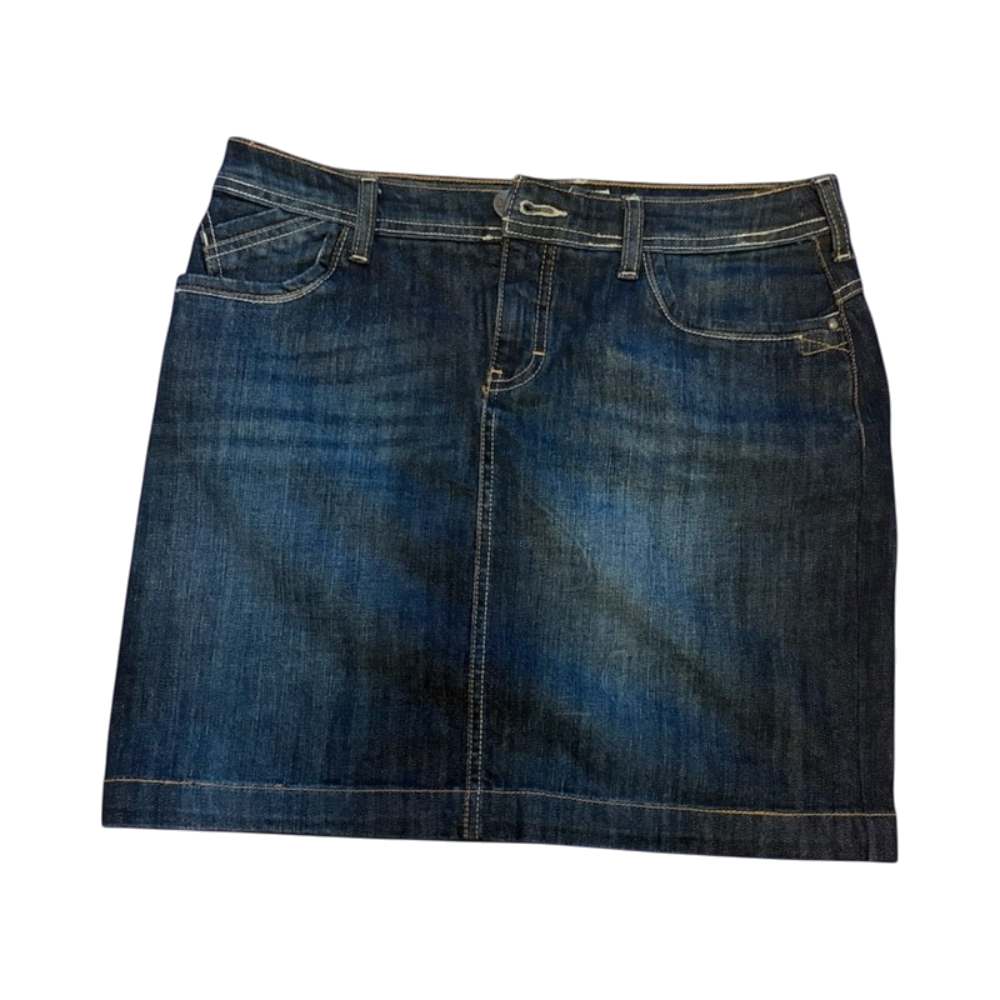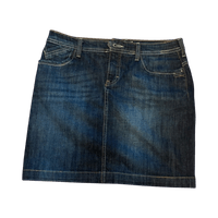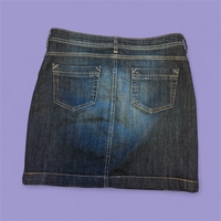Dark blue denim mini skirt with back pockets and contrast stitching.