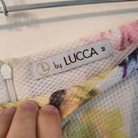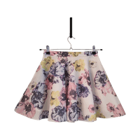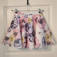 Valkopohjainen kellohame, pastellikukkakuvio, vyötäröllä vetoketju.