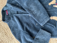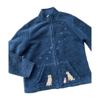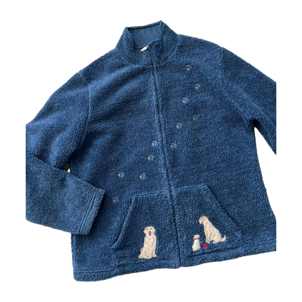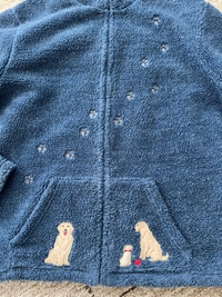 Sininen fleece takki koirakoristeilla, vetoketjulla.