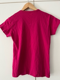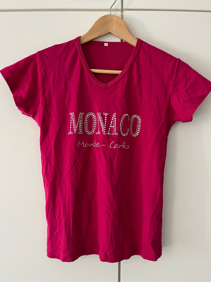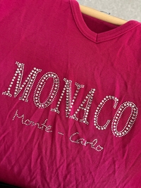 Fuksian värinen puuvilla t-paita strassatulla tekstillä ”Monaco Monte-Carlo”. Kokolapussa lukee L mutta vastaa kokoja S ja M paljon paremmin