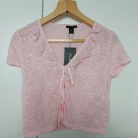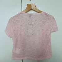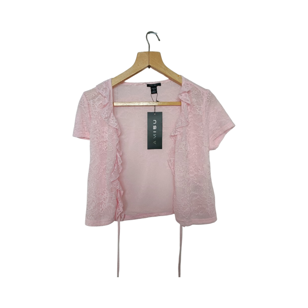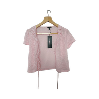 Vaalea pinkki pitsipaita, lyhyt ja röyhelöillä.