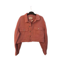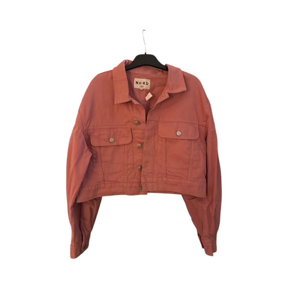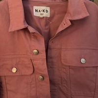 Lyhyt farkkutakki, nappikiinnitys ja rintataskut.