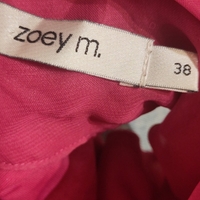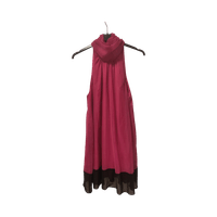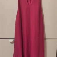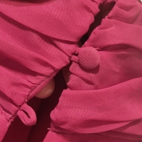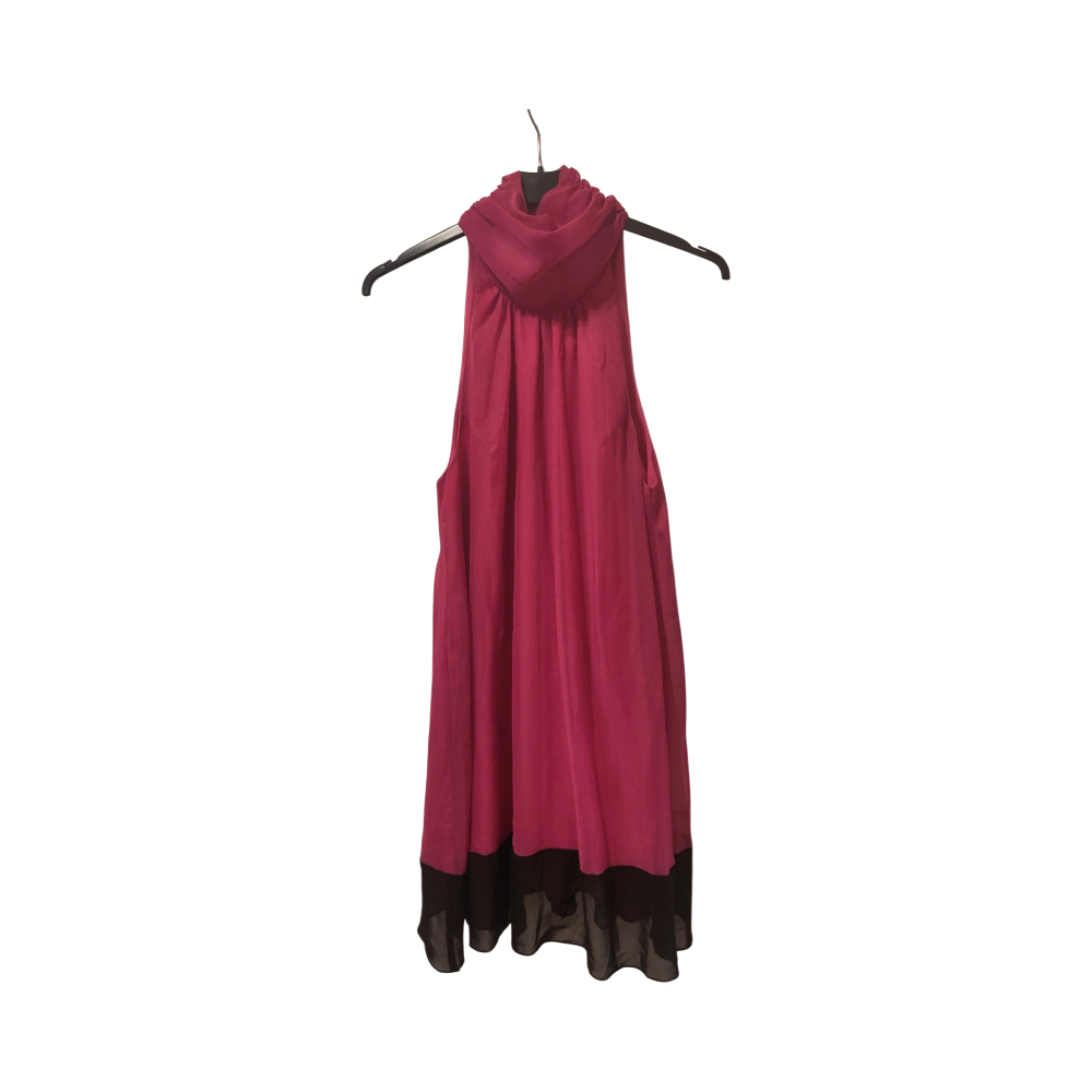 Fuksian värinen hihaton turtle-neck -juhlamekko läpinäkyvää, laskeutuvaa kangasta. Musta helmapala ja alushame. Takana nappikiinnitys. Yksi nappi kadonnut, muuten hyvä käytetty kunto.