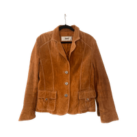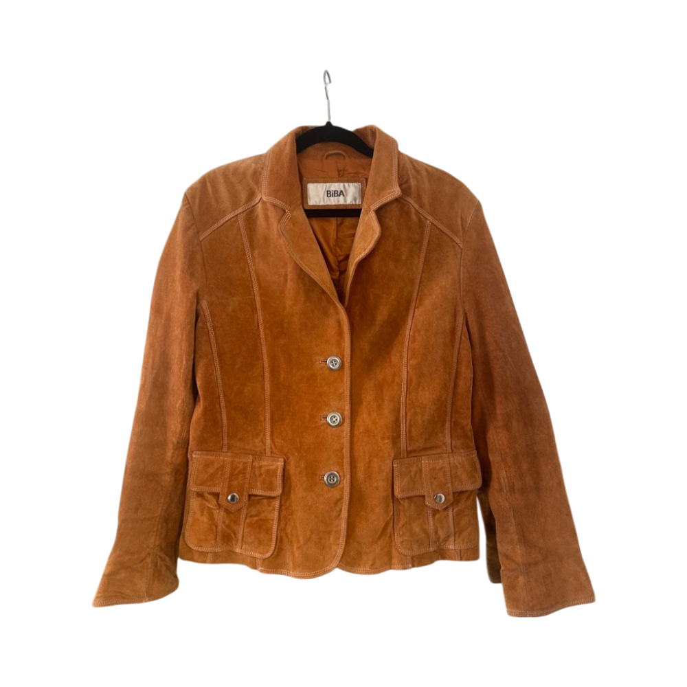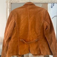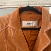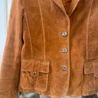 Aito porsaan mokkanahkainen bleiseritakki, vuorillinen. Nahka hyvässä kunnossa, mutta on jotain jälkiä käytöstä. Sisävuori on korjattu kun oli revennyt, se näkyy kuvissa. Istuu kokoa S-M. Merkki BiBA.