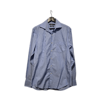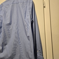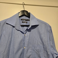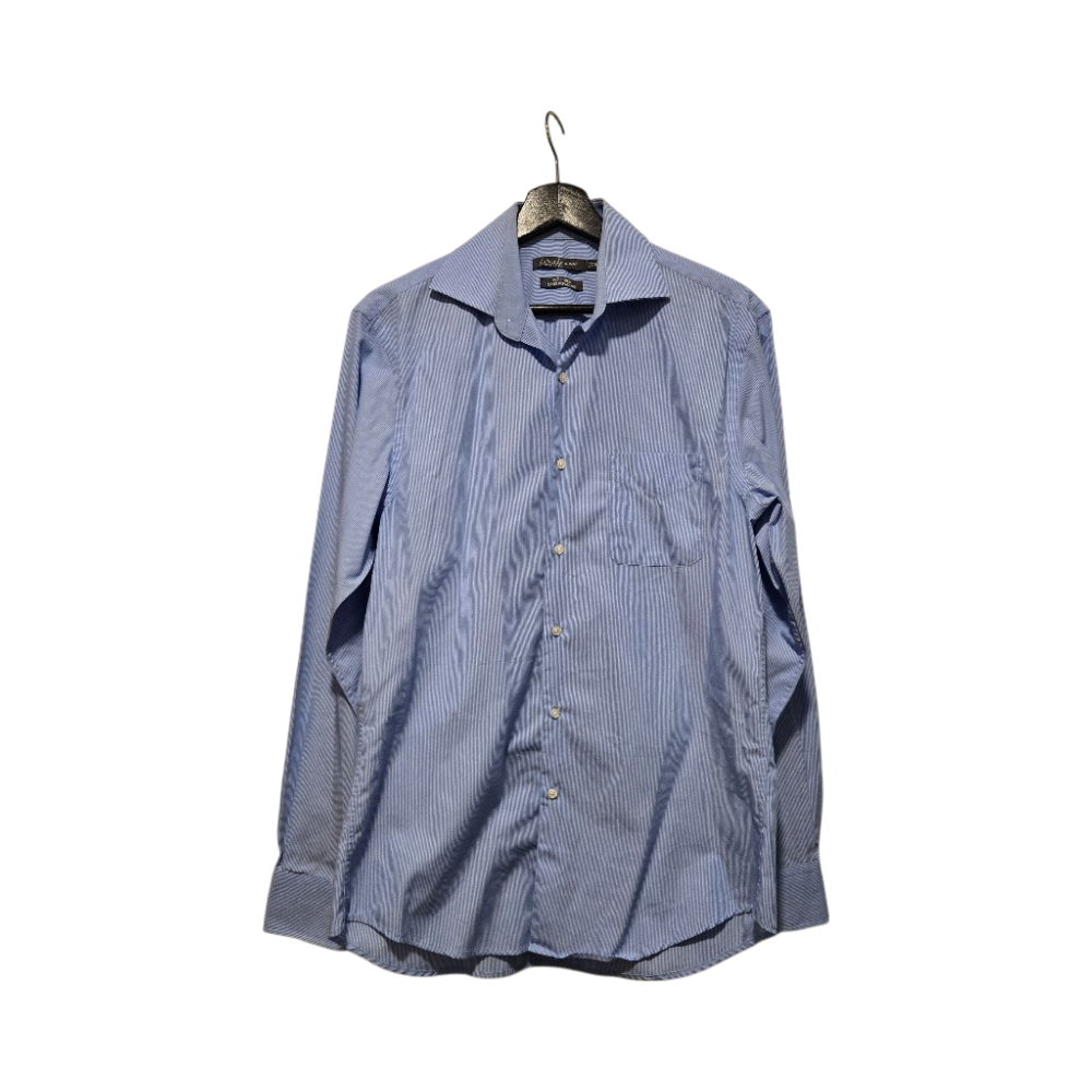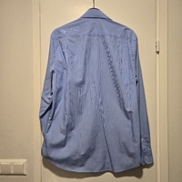 Vaaleansininen pitkähihainen kauluspaita, raitakuosi, nappikiinnitys. Koko 37/38, ollut käytössä M/L kokoisella.