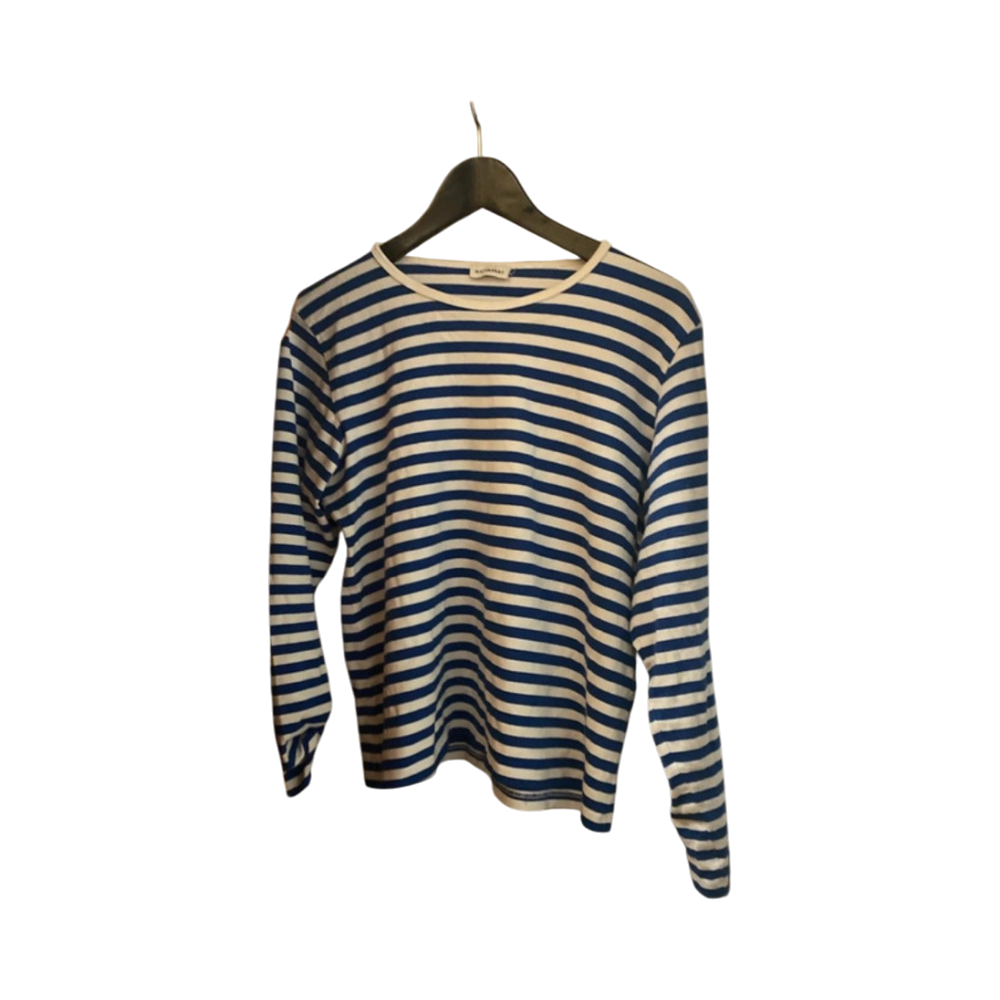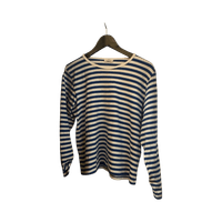 Blue and white striped long-sleeve cotton top, casual fit.