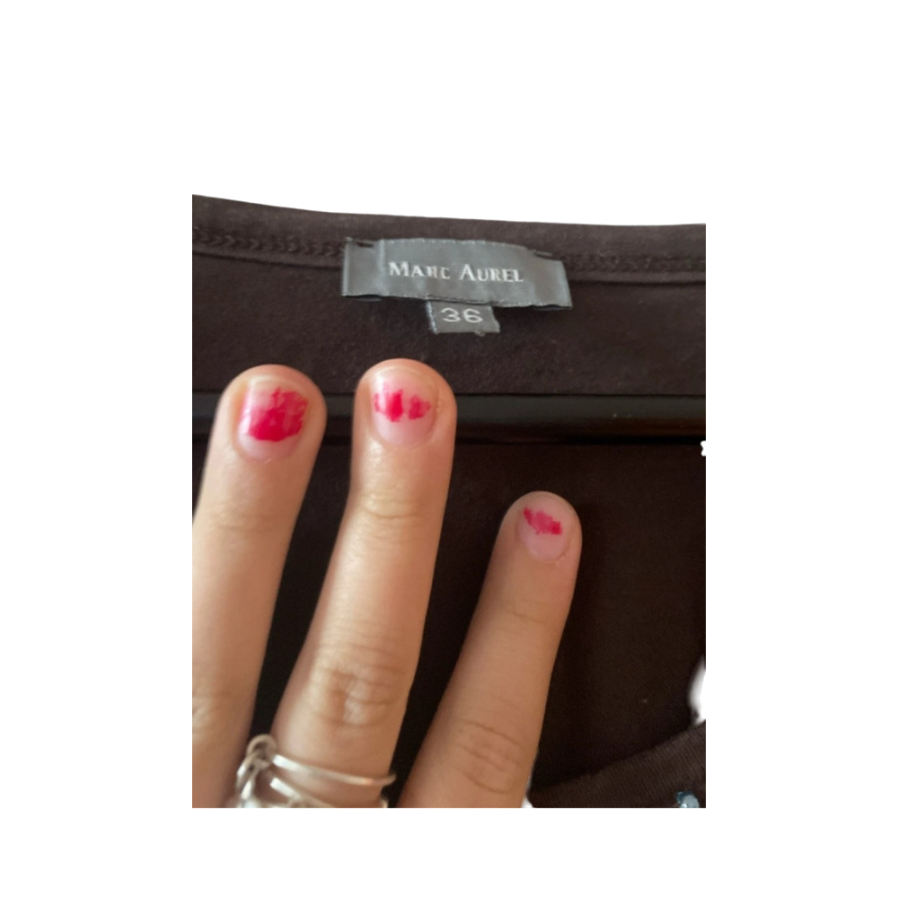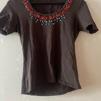 Brown short-sleeve top with decorative beaded neckline, casual fit.