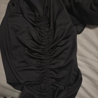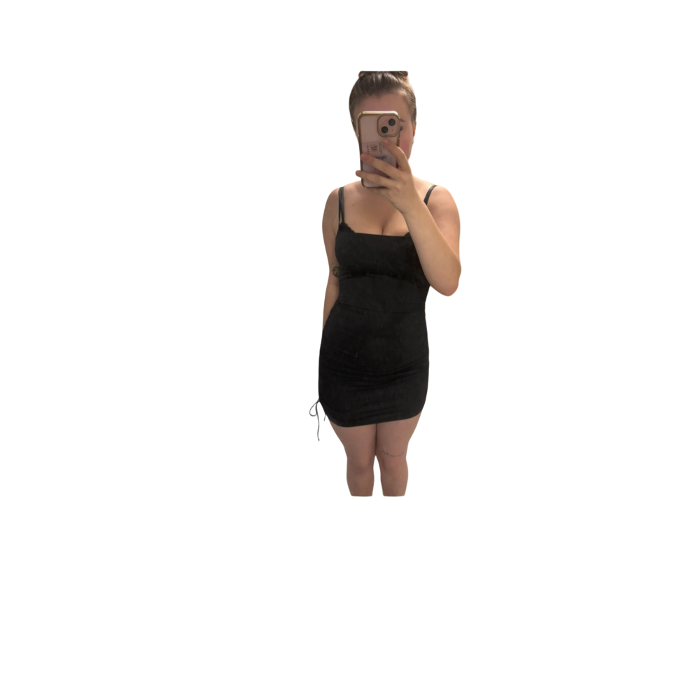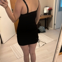 Lyhyt, vartalonmyötäinen musta mekko nyörityksellä sivussa.