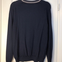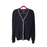 Siisti ja hyvin istuva neuletakki. Väri tummansininen / navy blue, jonka lisäksi tehostevärinä luonnonvalkoinen ja beigenruskea etuosan keskisaumaa pitkin menevä raidoitus joka tekee neuletakista aavistuksen bleiserimäisemmän.
