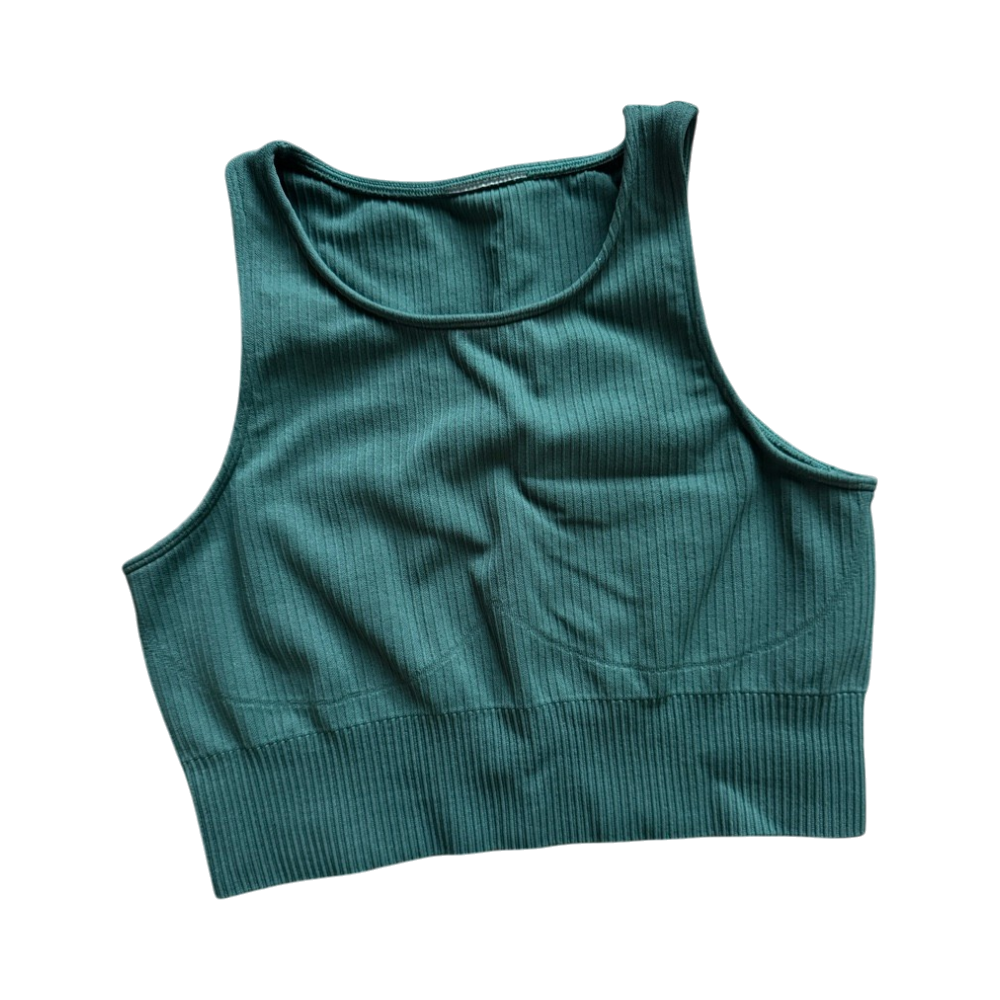 Tummanvihreä Aim’n Ribbed Seamless Crop Top. Polyamidi 92%, elastaani 8%. Käytetty vain kerran 😊