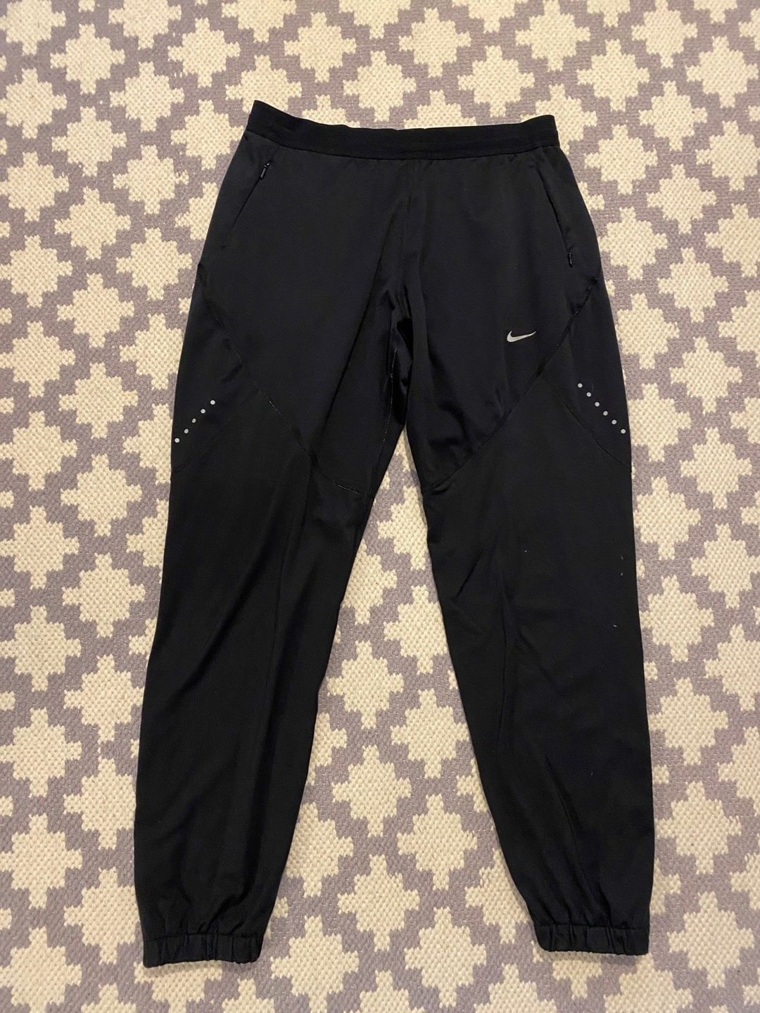 Niken mustat housut, koko M. Vetthylkivä pintamateriaali ja lämmin fleece- sisäpinta. Vyötäröllä kiristysnarut ja lahkeissa vetoketjut heijastavaa materiaalia. Toisessa lahkeessa edessä muutama valkoinen jälki, en ole kokeillut puhdistaa. Hieman nukkaa saattaa löytyä saumoista, mutta muutoin hyvä käytetty kunto. Koodi ML6961.