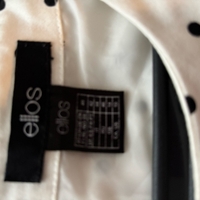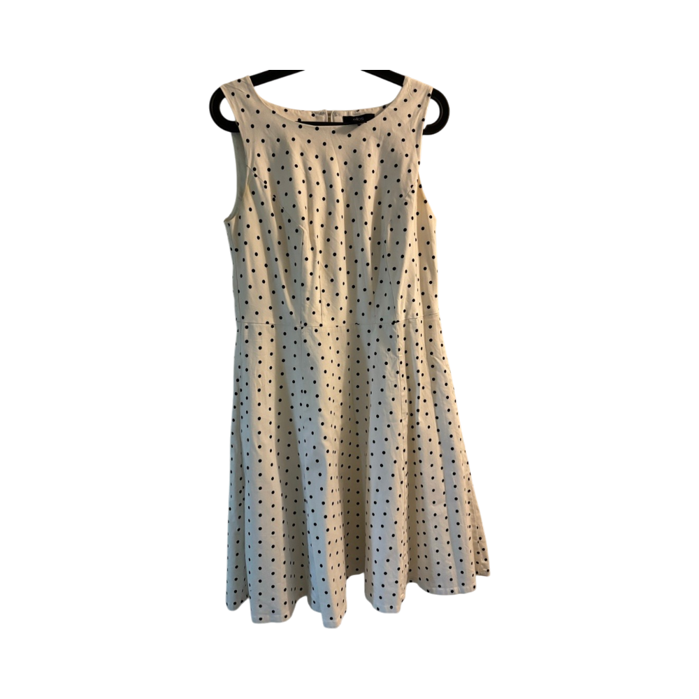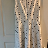 Valkoinen polkkamekko mustilla pilkuilla, hihaton, vetoketju selässä.