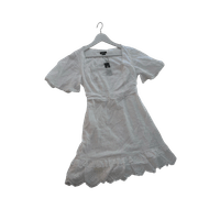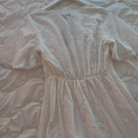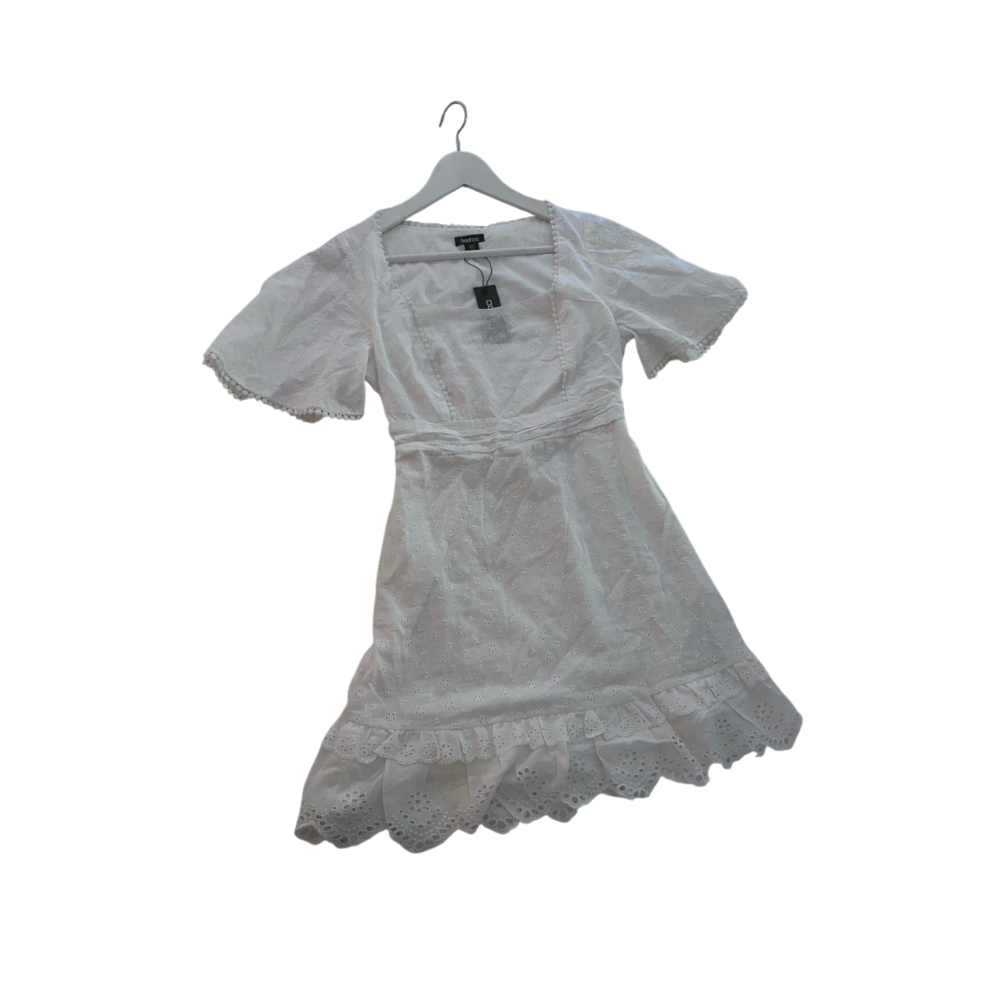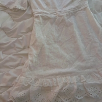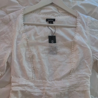 Lyhyt valkoinen broderie-helmityllä reunuksella.