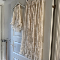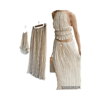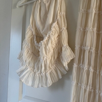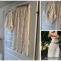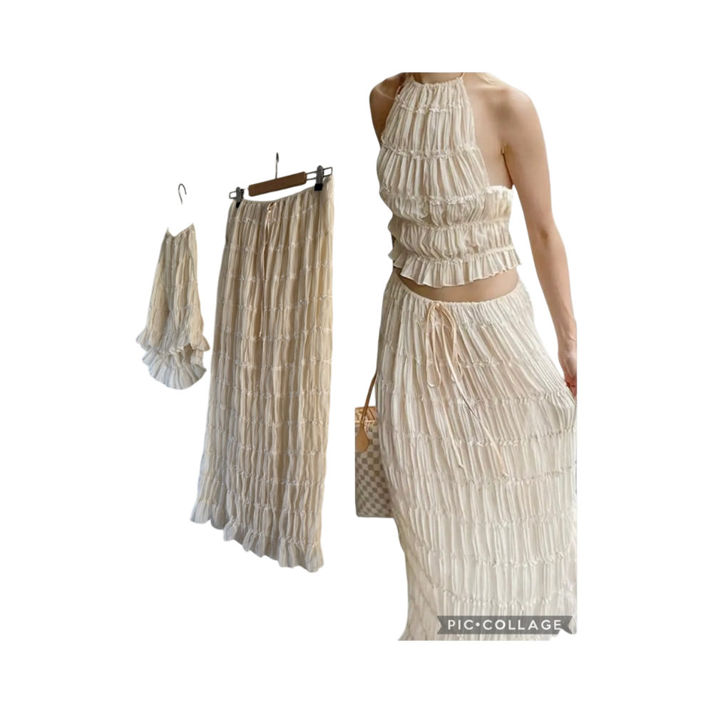 Valkohtoinen röyhelöinen pitkä hame ja olkaimeton toppi, kevyt.