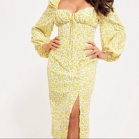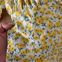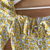 Nellyn keltainen kukkamekko. Saumassa pientä jälkeä (3. Kuva), mutta huomaa vain kun tarkkaan katsoo.