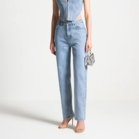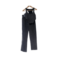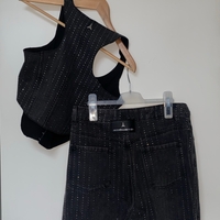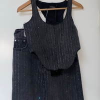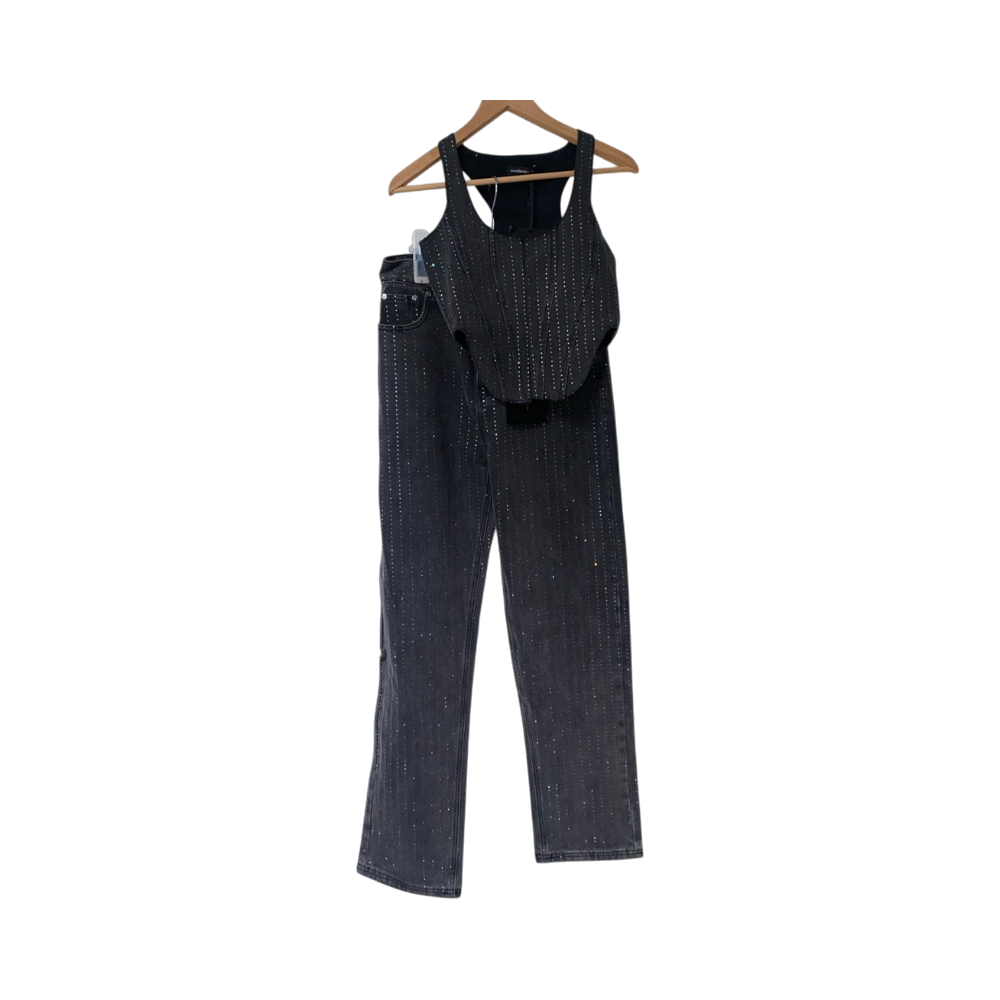 Black/dark grey denim corset-style tank top and pants with rhinestone embellishments. Unused with tags on. Runs a bit small in my opinion since it doesn’t stretch. Pants have a strap inside waistline to tighten if necessary.