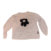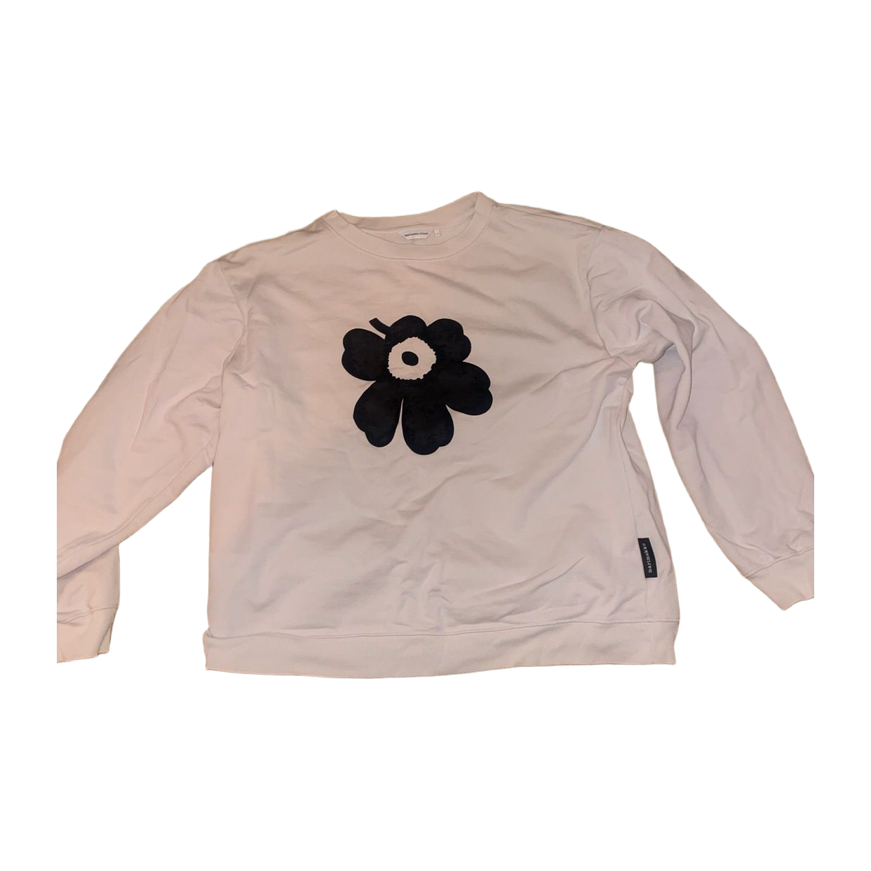 Marimekon college paita. Unikko-logo nukkaantunut pesussa (kuva2) ja oikeassa hihassa kaksi reikää (kuva3). Muuten käytön jälkiä ei näy.