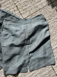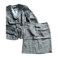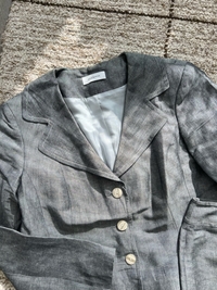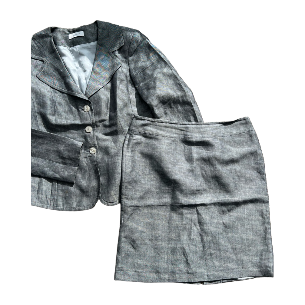 Andiatan klassinen hamepuku, hyvin laskeutuvaa pellavasekoitetta. Koko 42, hameen pituus 59cm ja vyötärönympärys 90cm. Bleiserin pituus 66cm ja kai kai mitta noin 54cm. Yleisilme hyvä, käytönjälkeä