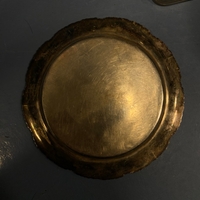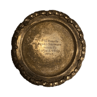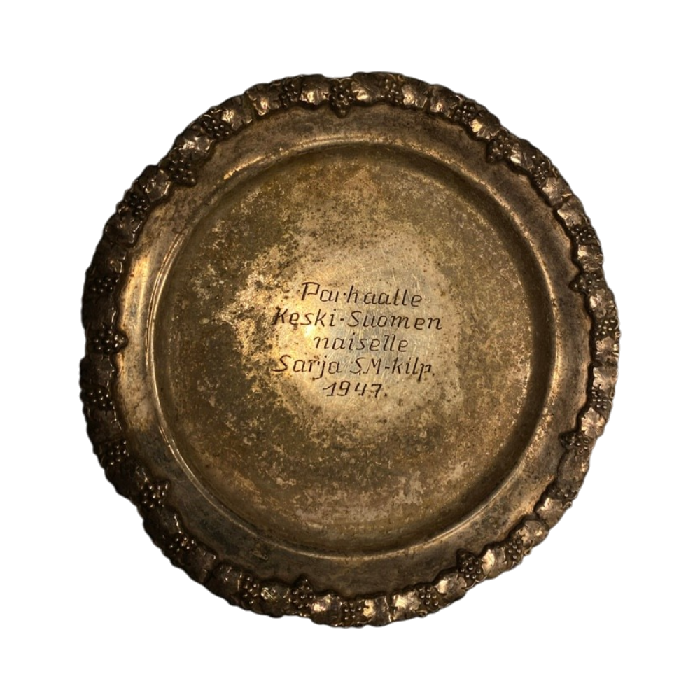Vanhanaikainen koristeltu tarjotin, kaiverrus vuodelta 1947.