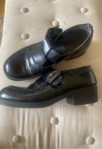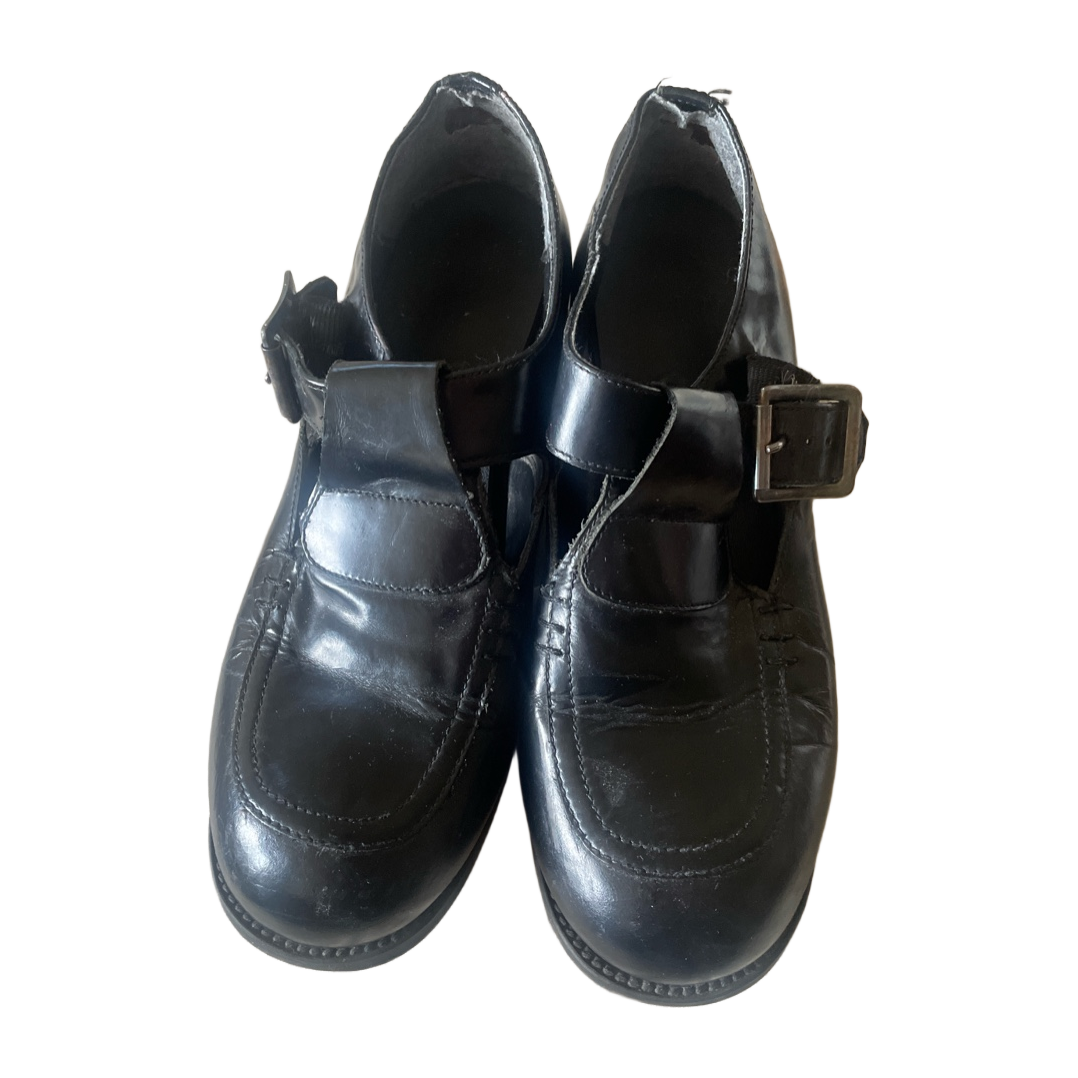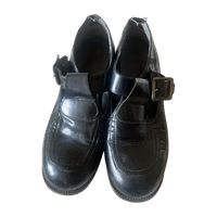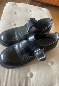 Käytetyt mustat nahkakengät, tosi tukevasti tehty. Prahasta ostettu aikoinaan, siten pidetty, että kantalaput saisi uusia. Samoin soljen kiinnityskuminauha on ajan saatossa menettänyt kimmoisuutensa. Silti näillä on elinikää vielä oikeasti kauan, todella hyvää laatua noin muutoin. Virheet huomioitu hinnassa.