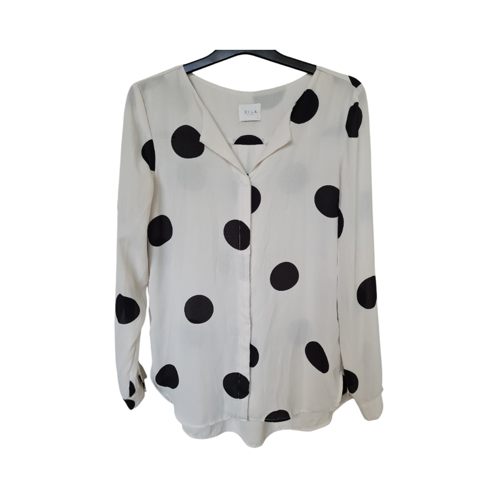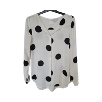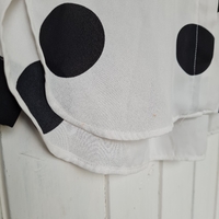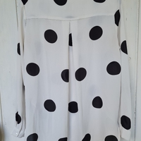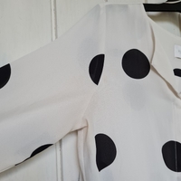 Valkoinen pitkähihainen pusero mustilla pilkuilla. Kaipaisi valkaisua (3. ja 4. kuva).