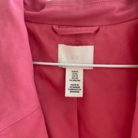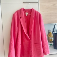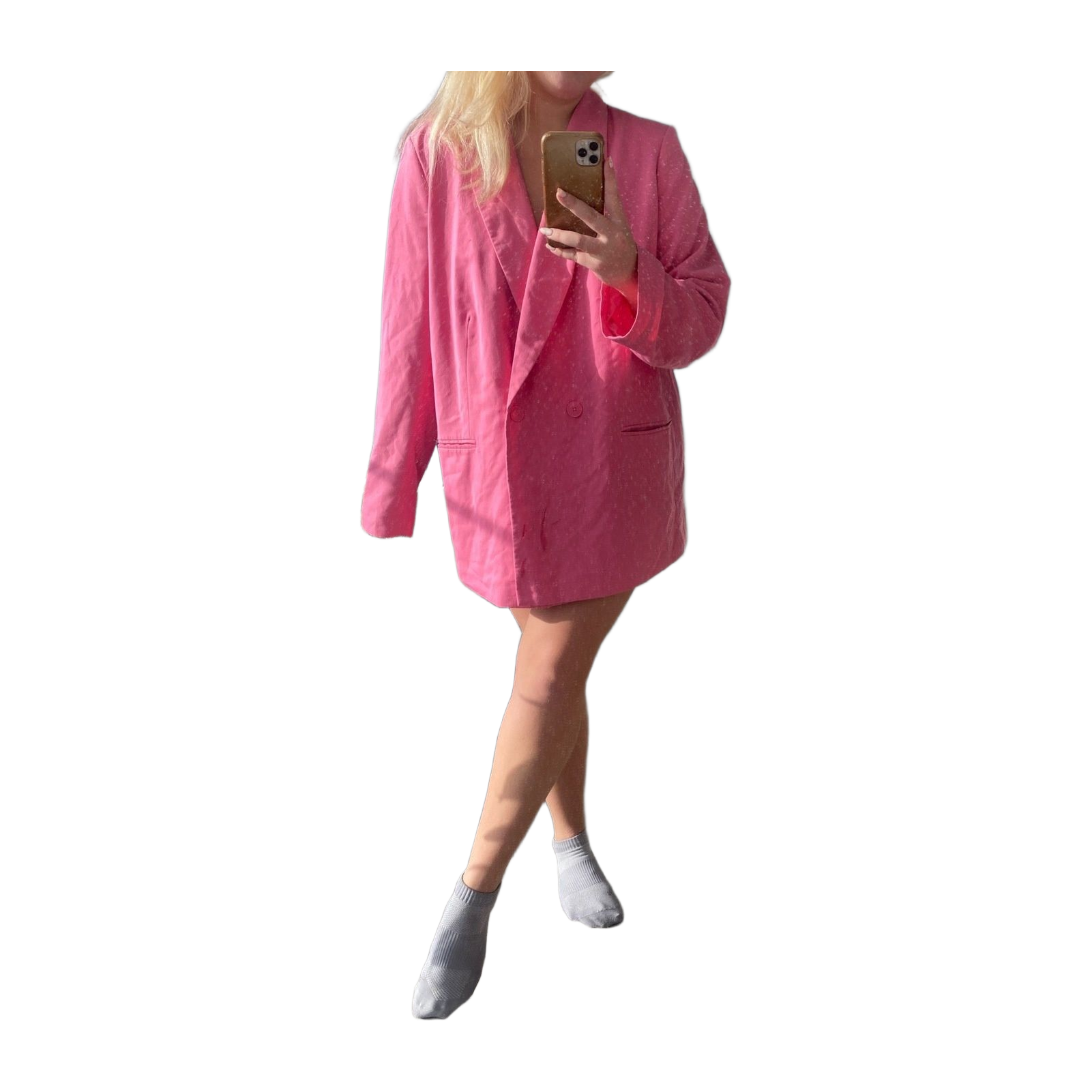 Pinkki oversize bleiseri🩷väri säilynyt kirkkaana ja sileä hyväkuntoinen kangas. Miinuksena kuvissa näkyvä kynsilakkatahra joka ei ole tavallisessa konepesussa lähtenyt, enkä ole kokeillut poistaa kynsilakan poistoaineella tms.