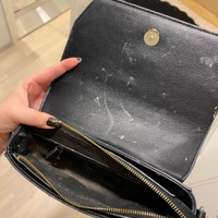 Valentinon tilava pikkulaukku🖤 Kuten kuvasta näkyy, meikkivoidepullo levinnyt sisäosaan ja aiheuttanut tahroja, joita en ole puhdistanut, sillä laukulle ei ole ollut käyttöä. Muuten nahka pysynyt hyvin siistinä, ei kulumia. 4v sitten ostettu, joten ei enää kuittia tallella.