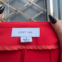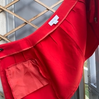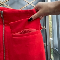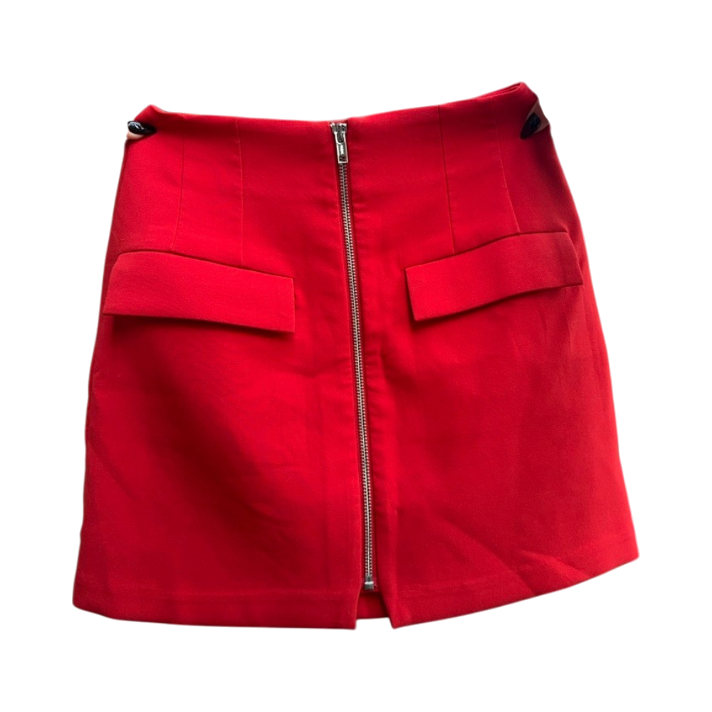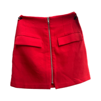 Lost Inc Bright red high-waist mini skirt with front zip and pockets.