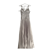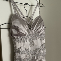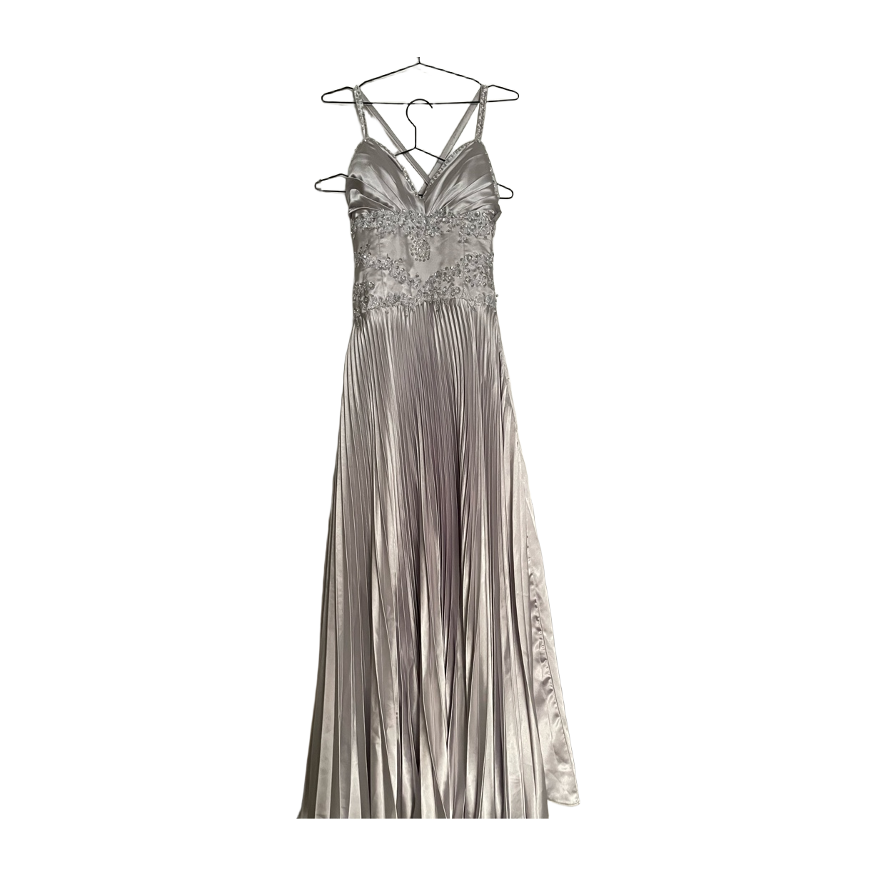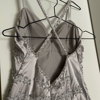Hopeanvärinen juhlamekko helmikoristeilla ja pliseeratulla helmalla. Koko S-M. Edestä muutamia helmiä irronnut (näkyy viimeisessä kuvassa). Ostettu käytettynä, mutta olikin itselle aivan liian pitkä (oon 170cm, kuvissa ei kenkiä jalassa). Mekossa ei ole mitään lappuja, mutta vastaa suunnilleen kokoa S.