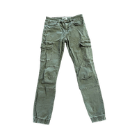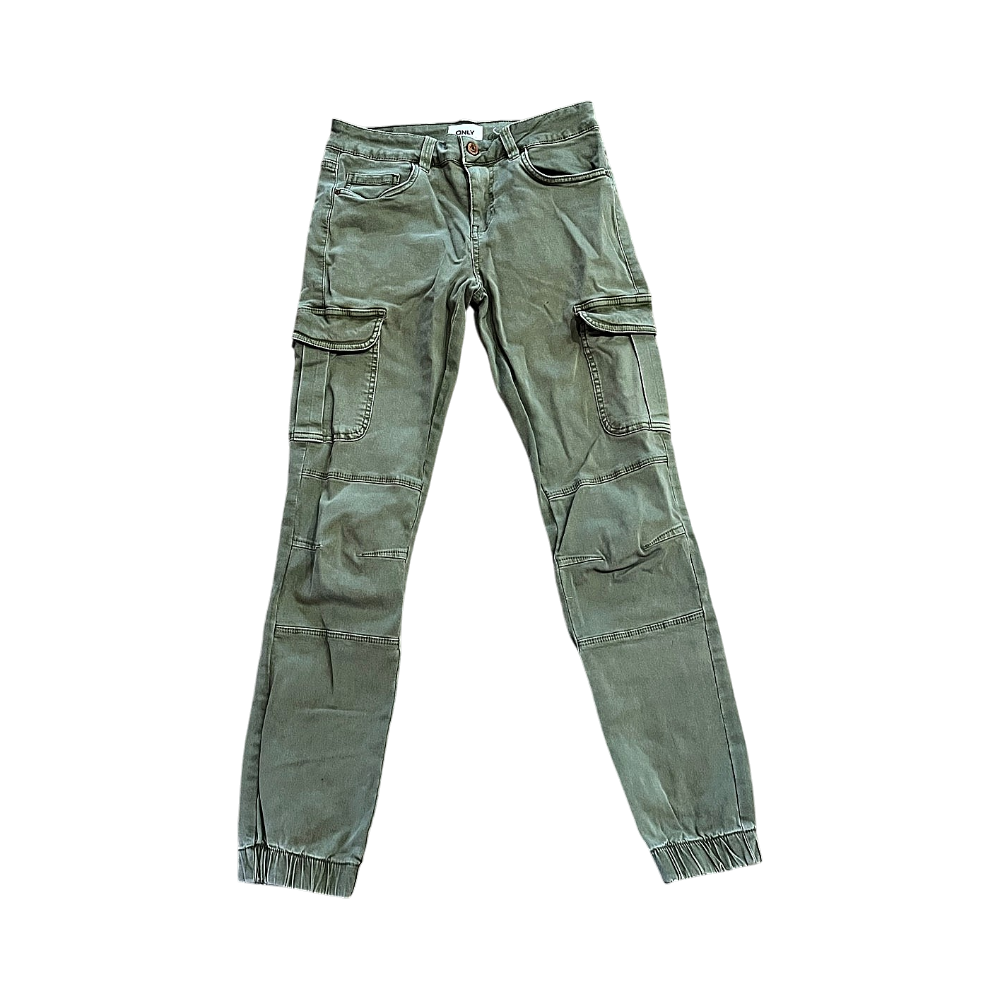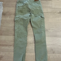 Vihreät matalavyötäröiset ja nilkkapituiset cago-farkut. Koko 36, pituus 32. Vyötärön ympärys noin 68 cm. Pienet tahrat etureidessä ja lahkeissa.