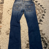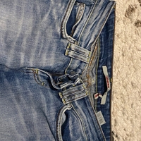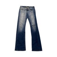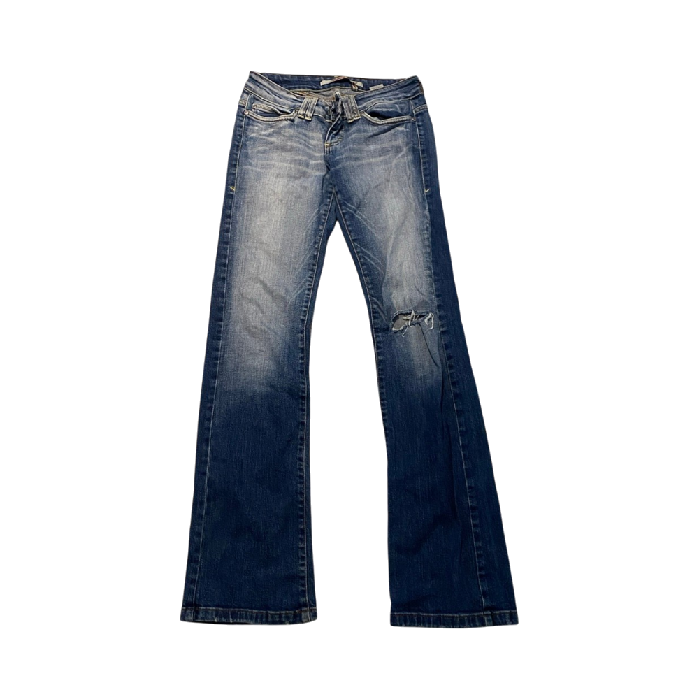 Siniset bootcut-farkut, revitty yksityiskohta polvessa.